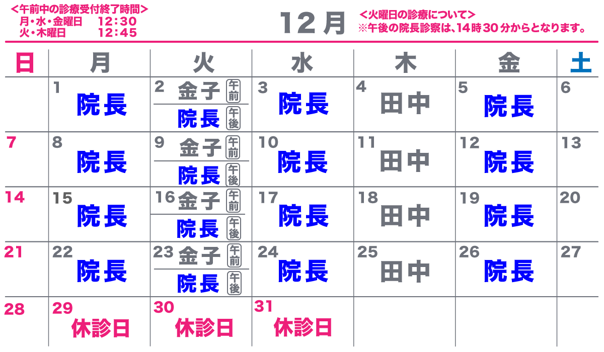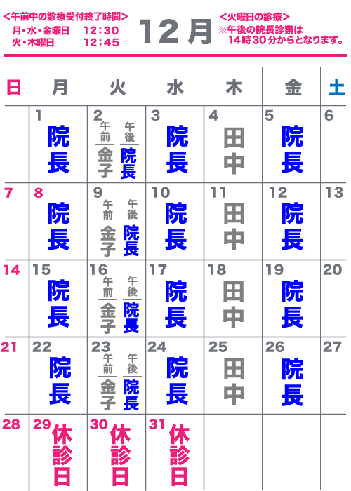 月、水、金曜日の午前診療は12時半受付け終了となります。